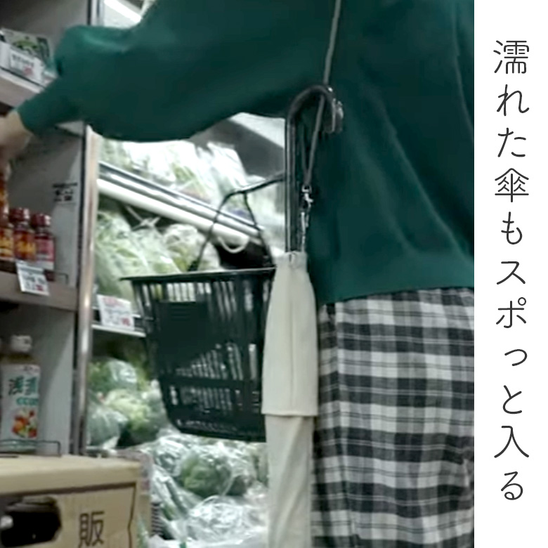 濡れた傘も簡単に収納でき、バックなどに付けられるフックと肩掛けできるストラップ付きで傘を使用している時もしていない時も持ち運びに便利。